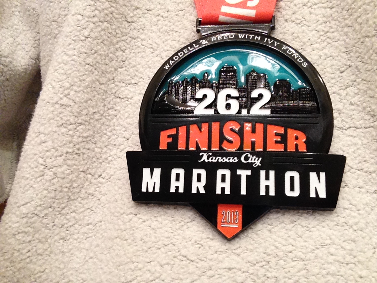 This medal I’m wearing below from the KC Marathon is the most impressive medal I’ve received yet. It actually has some heft to it. I came in about the middle of the pack at that race. I’d like to think they gave one that weighs a little bit less to the guy who came in last.